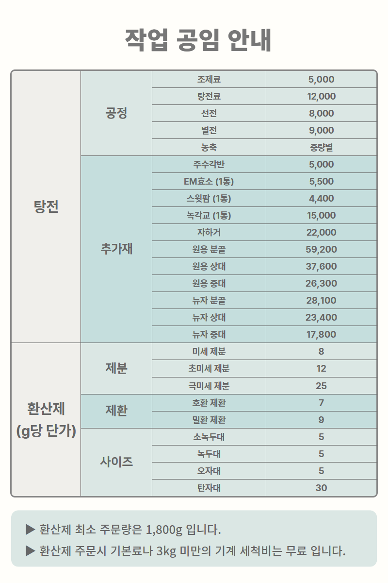 행림원외탕전원은 작업 공임 이외에 기본료나 기계청소비를 별도로 책정하지 않습니다.